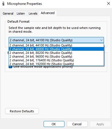 如果您沒有聽到任何聲音,或者聲音不正確,請確保將採樣率更改為 16 位、48'000 Hz(如果您可以使用此選項)。其他應用程序也可能會阻止您的音頻設備正常工作。為了防止程序改變您的音頻首選項,請確保取消選中允許應用程序獨占控制該設備選項並應用您的更改。