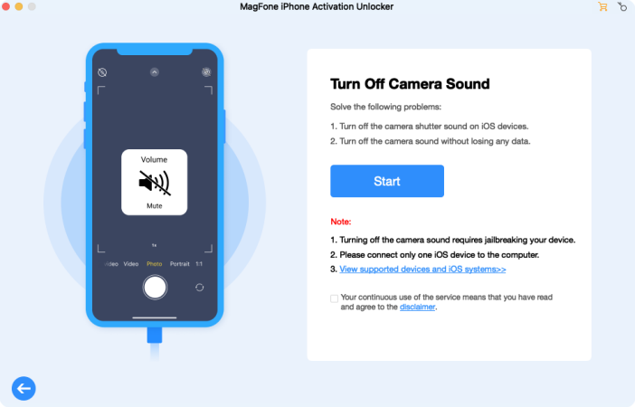首先,在計算機上安裝並啟動 MagFone Activation Unlocker,然後在主界面上選擇關閉相機聲音。之後,單擊“開始”按鈕並仔細閱讀免責聲明。如果您同意這些條款,請單擊“同意”按鈕,然後通過 USB 線將 iPhone 連接到計算機。