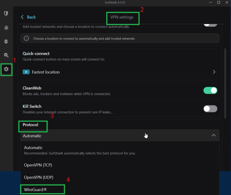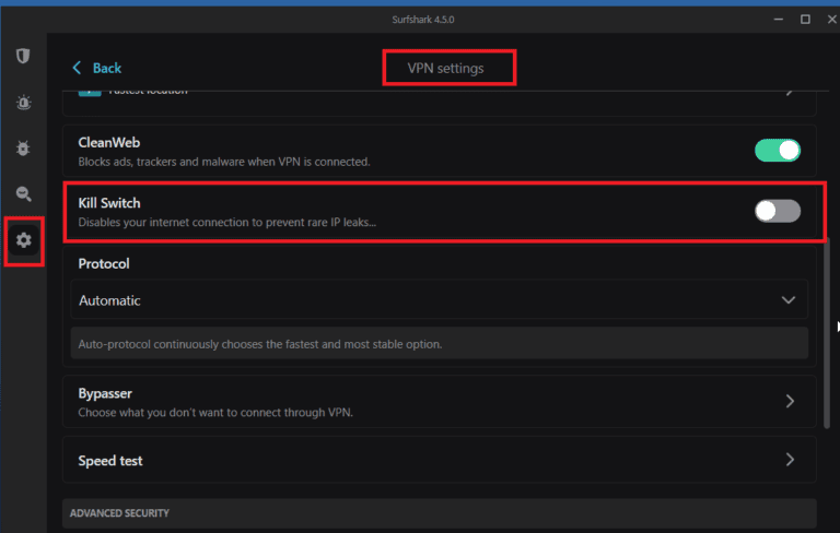 - 啟用 Surfshark 終止開關,這樣您的 ISP、學校管理員、雇主或公共 Wi-Fi 管理員就不會發現您正在使用 Chaturbate。前往設定>VPN 設置>打開終止開關。