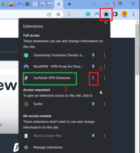- 單擊擴展程序圖標,然後單擊“”旁邊的圖釘圖標Surfshark VPN 擴展,”將其添加到您的快速訪問菜單中。