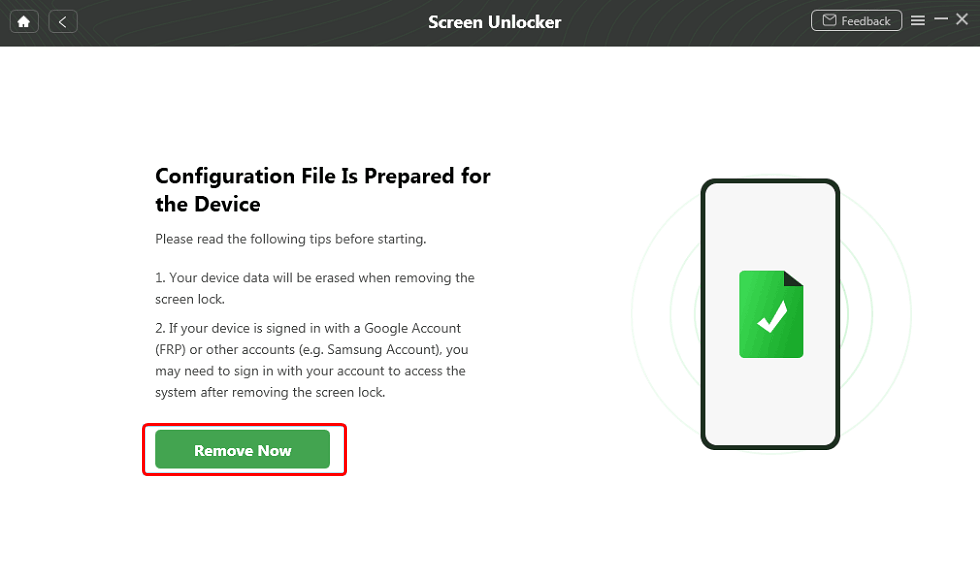 步驟 4.一段時間後,您將看到“屏幕鎖定解除完成”屏幕,如下所示。