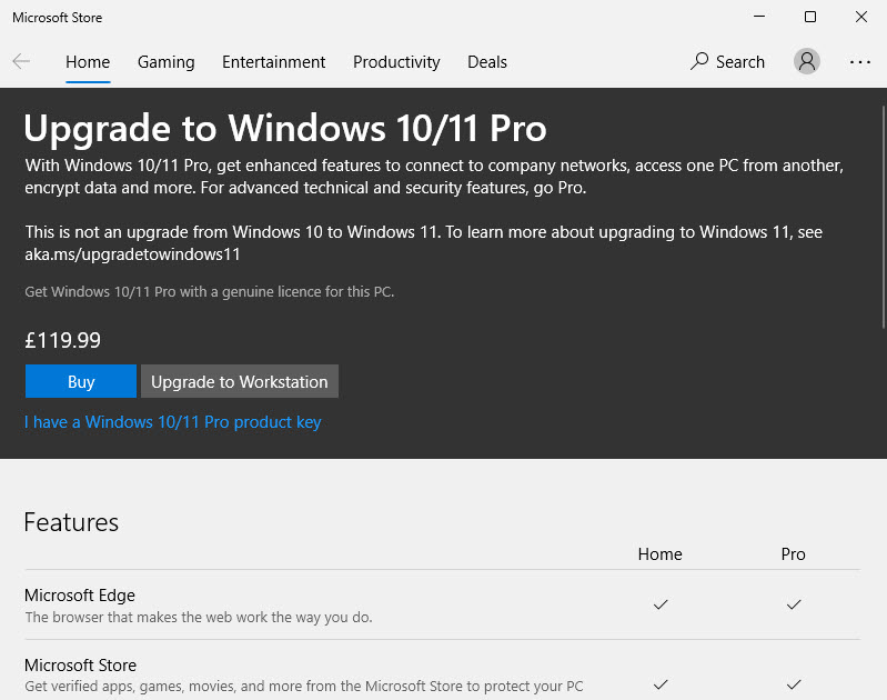 您將被帶到Microsoft Store,並顯示升級Windows副本將花費多少。您可以使用銀行或信用卡通過商店進行購買。