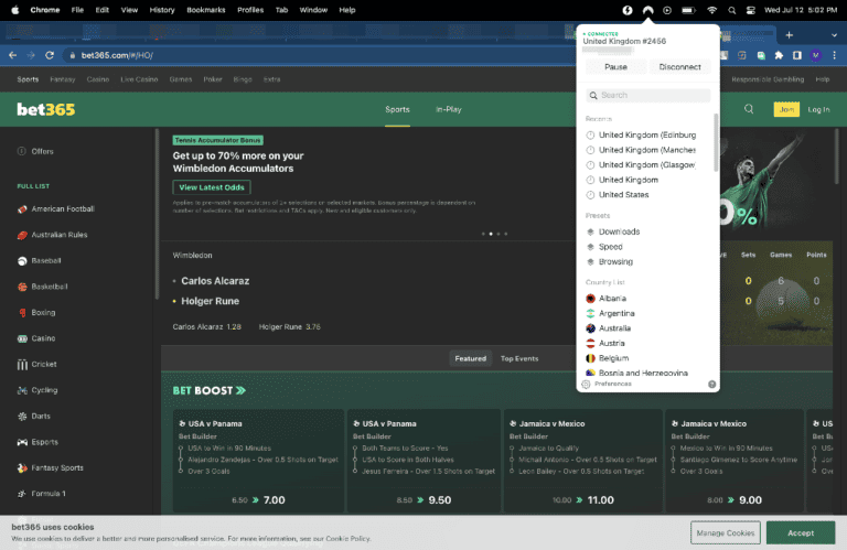 - 連接到 Bet365 未被阻止的其他地區的服務器,例如澳大利亞或非洲。