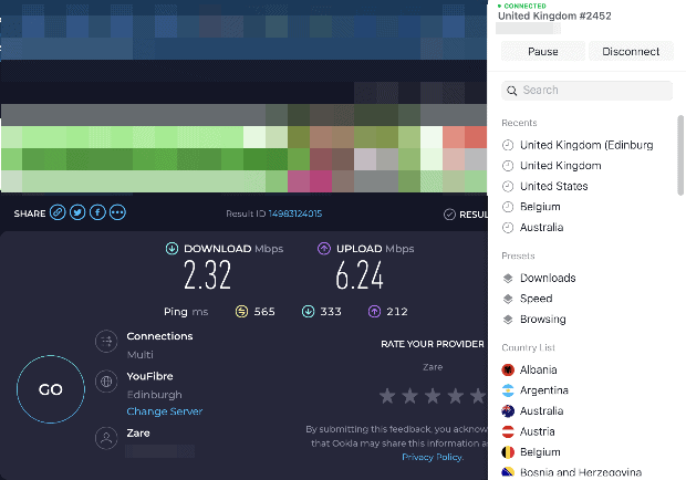 我很喜歡最快速度英國 – 愛丁堡服務器和OpenVPN UDP, 和立即打開 VPN TCP。它的速度為2Mbps反對我的互聯網6Mbps。