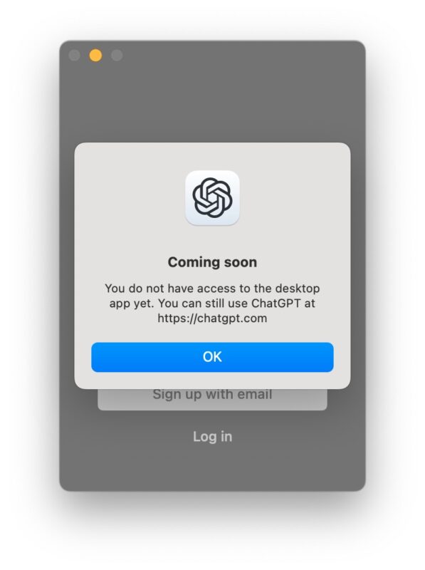 OpenAI recently announced that an official ChatGPT app for Mac was coming with ChatGPT 4o support, complete with some pretty cool features like a keyboard shortcut to open a ChatGPT query from anywhere (kind of like Spotlight, but for ChatGPT), screenshot capabilities, ability to initiate discussions based on photos (for example, provide a picture of a plant and let ChatGPT determine what it is and how to care for it), and a very advanced voice conversation feature that blows Siri, Alexa,以及其他所有語音助手都完全消失了。但是OpenAi的一部分公告是Mac的ChatGpt是“即將推出的”,因此,所有用戶都無法下載它,即使您確實設法下載了Mac的ChatGpt應用程序(來自朋友,社交媒體鏈接或在ChatGpt論壇上找到),您也會出現“很快就會出現 - 您無法訪問桌面應用程序的訪問權限。”