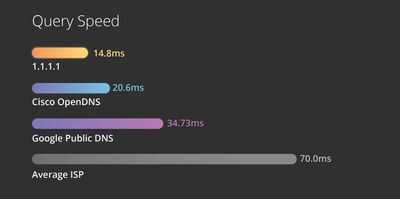Cloudflare 網絡的強大功能使 1.1.1.1 在提供快速 DNS 查詢方面具有優勢。由於它已部署在 Cloudflare 全球 1000 多台服務器上,全球用戶都可以從 1.1.1.1 獲得快速響應,這應該會讓他們的互聯網使用整體感覺更加快捷。此外,這些服務器可以訪問 Cloudflare 平台上超過 2000 萬個互聯網資產,從而使對這些域的查詢變得非常快。