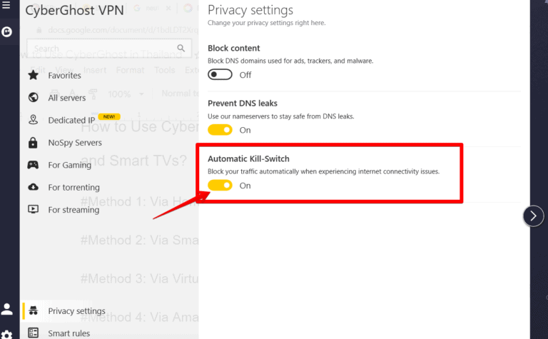 - 切換“自動終止開關” 開啟。如果 CyberGhost VPN 連接斷開,這可以防止 TOT、True Online、KSC Internet 或您的泰國 ISP 和計算機犯罪法 (CCA) 執法人員看到您的在線活動。