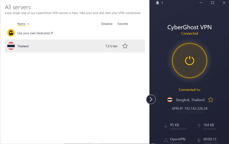 CyberGhost 在泰國沒有專用 IP。相反,您可以購買其他 CyberGhost 專用 IP,您可以在泰國使用這些 IP。美國,加拿大,澳大利亞,新加坡,荷蘭,英國, 和德國。
