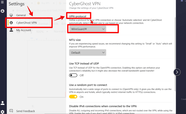 - 選擇 ”CyberGhost VPN,”然後在“下選擇合適的 CyberGhost VPN 協議VPN協議”。我推薦線衛因為它在訪問泰國被阻止的應用程序/網站(Telegram)和內容頻道(Netflix 庫、YouTube、Hulu 等)時提供安全性和速度。