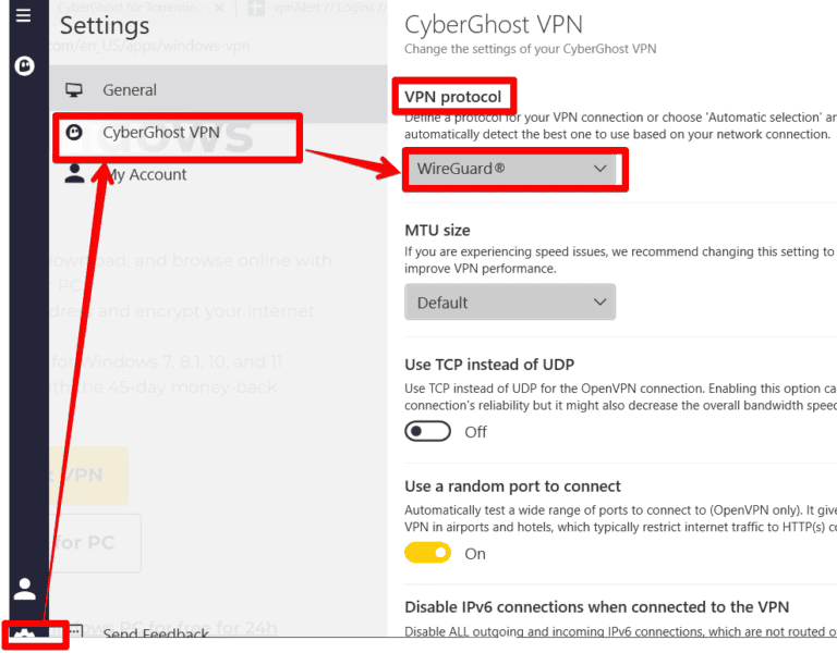 - 點擊設置圖標>CyberGhost VPN 圖標,然後在“下選擇合適的協議VPN協議”。我推薦“線衛” 提供可靠的安全性和最高的速度。