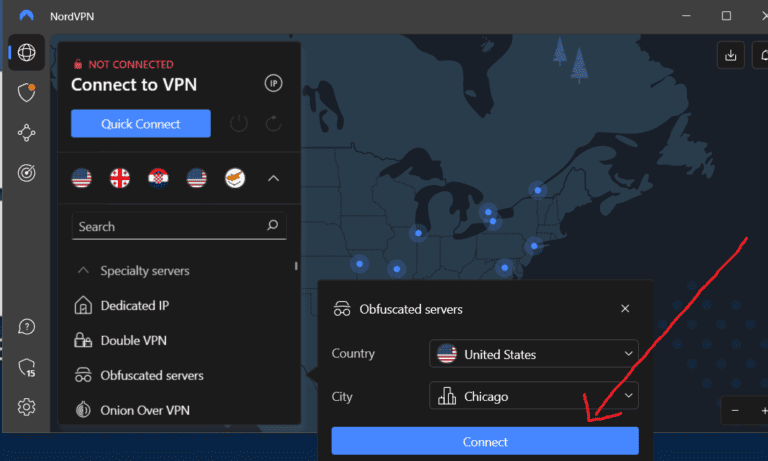 - 選修的:單擊下拉菜單搜索 NordVPN 服務器或連接到專業服務器。然後點擊服務器進行連接。