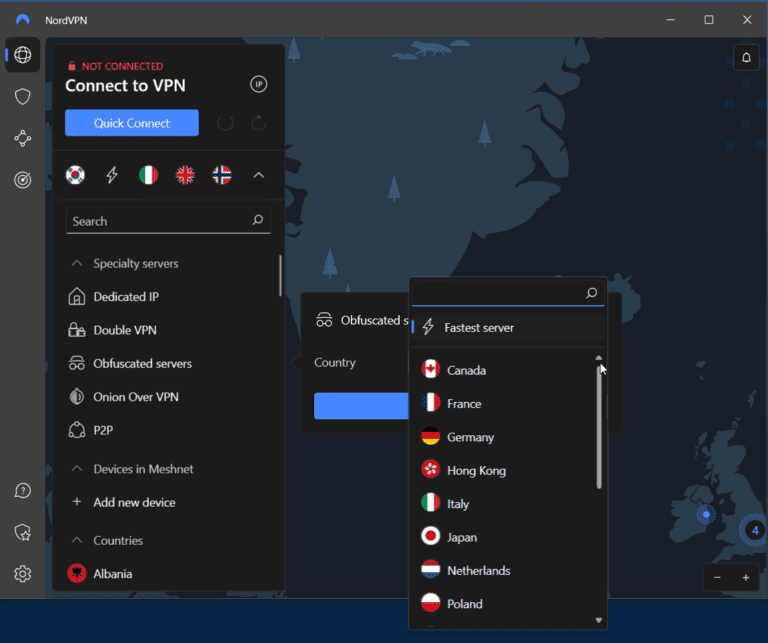 - 點擊 ”快速連接” 獲取 NordVPN 推薦的最快/最近的位置。