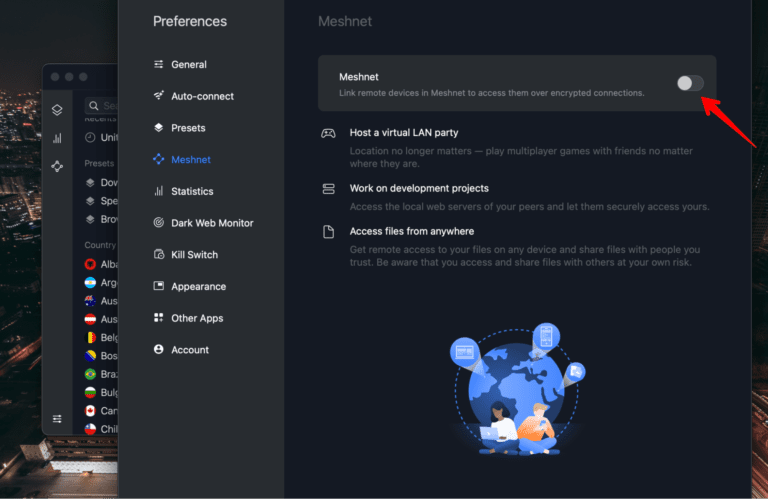 你可以使用NordVPN 網狀網絡直接地通過 NordVPN 應用程序,讓您能夠享受的優點LAN 和 P2P 網絡在一個更安全,加密的, 和快速環境。