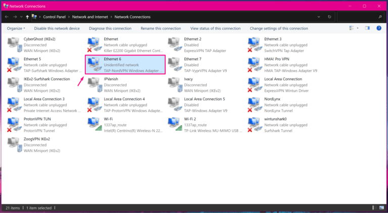 - 你應該看到TAP-NordVPN Windows 適配器在你的某個地方網絡連接窗戶。我的出現在名稱“以太網6”。