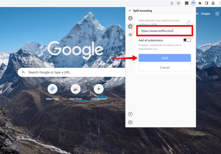 - 單擊“輸入您想要繞過 VPN 隧道的網站添加“ 按鈕。