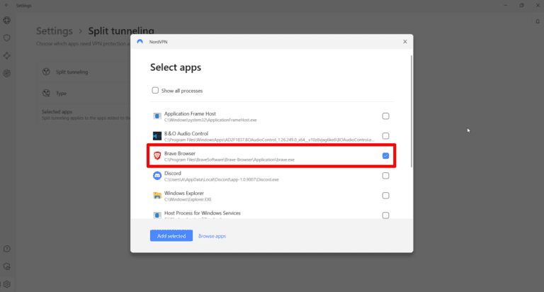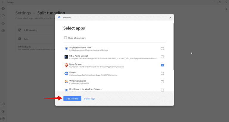 - 如果您選擇第一個選項,請單擊“添加選定的”按鈕,然後選擇要從 VPN 隧道中排除的所有應用程序。