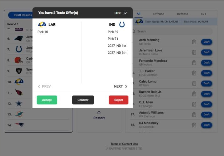 PFN 模擬選秀模擬器是一個在線工具或平台,旨在幫助 NFL 球迷、夢幻橄欖球運動員和選秀愛好者模擬 NFL 選秀過程。它允許用戶根據真實的選秀場景、球隊需求和球員排名為每個 NFL 球隊選擇球員來創建和測試模擬選秀。對於球迷來說,這是練習選秀策略、探索潛在交易並了解選秀日可能如何進行的有用方法。其主要功能通常包括: