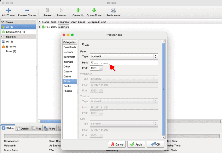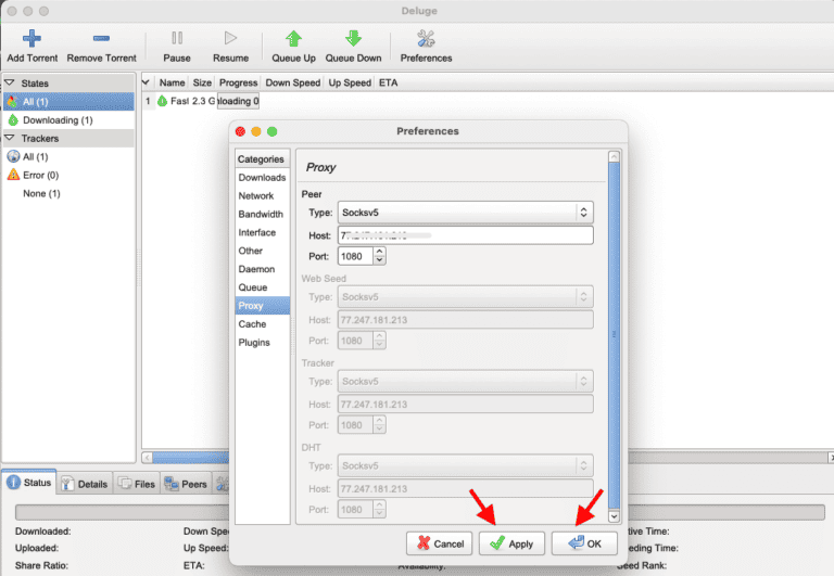 - 確認您在 Deluge 中輸入了正確的代理服務器設置。