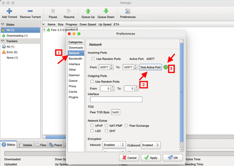 - 測試您的端口轉發設置: 在下面偏好設置>網絡, 點擊 ”測試活動端口”。如果右側出現綠色按鈕,則端口轉發功能正常。