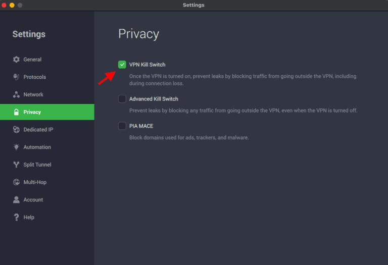 PIA 應用程序包含 VPN 終止開關功能,可在 VPN 連接斷開時幫助保護您的隱私。在這種情況下,終止開關會自動切斷您的互聯網連接,以確保您的真實 IP 地址在下載種子時不會意外暴露。
