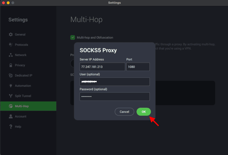 - 您需要輸入詳細信息,例如服務器IP地址,端口號和 SOCKS5 登錄憑據(用戶名和密碼)。