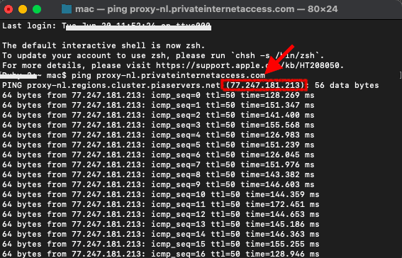 - 為了得到你的服務器IP地址,輸入命令“ping proxy-nl.privateinternetaccess.com”進入命令提示符 (Windows) 或終端(Linux 或 macOS)。您將在後面的響應中找到 IP 地址。PIA 的默認端口號是“1080”。
