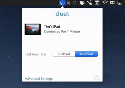 一旦你開始工作,就值得檢查一下 Duet 的顯示選項:單擊 Mac 菜單欄中的 Duet 小程序,如果你連接了 iPad,你會在 iPad 屏幕底部看到一個按鈕,用於啟用觸控式 MacBook Pro 風格的 Touch Bar。