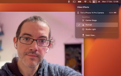 要啟用上面列出的任何視頻效果,請打開控制中心從 Mac 的菜單欄中,然後單擊視頻效果在不同模式之間切換。