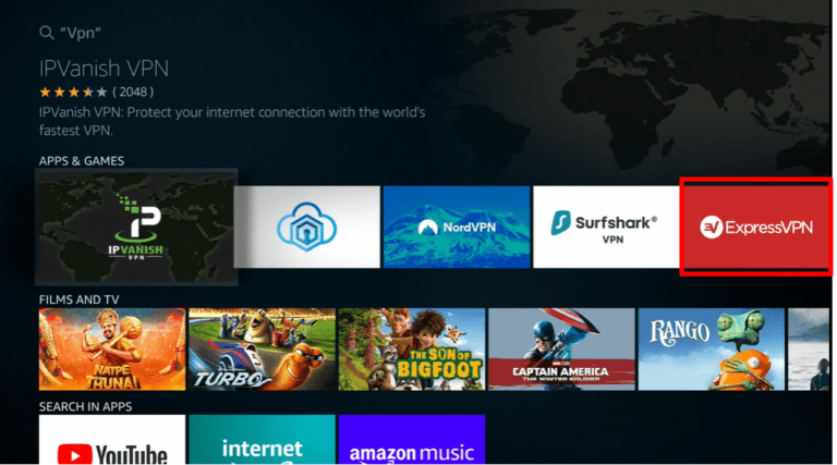 - 單擊搜索選項卡並輸入“VPN“在您的 Amazon Fire TV 棒上。將會顯示幾個 VPN 選項。