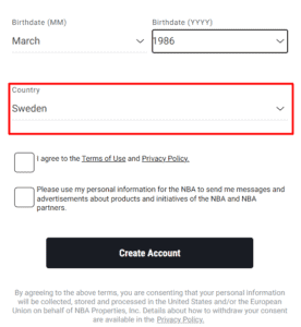 - 如果您要創建 NBA ID,請注意表單如何自動檢測您的 VPN 位置,而不是您的真實位置!