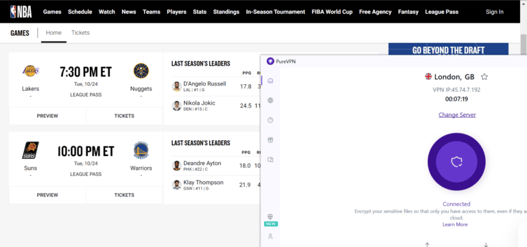 - 連接到 NBA League Pass 未被封鎖的美國州的 PureVPN 服務器。