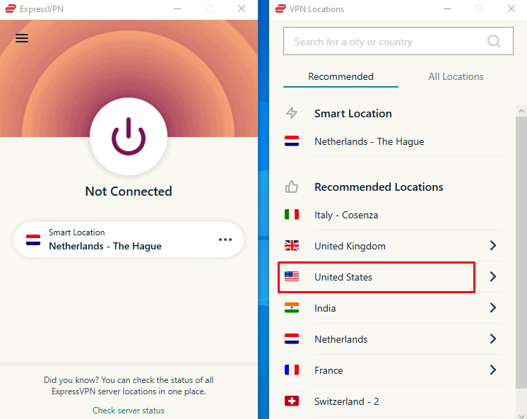 - 單擊“”旁邊的三點線智能定位” 訪問 ExpressVPN 服務器列表。導航至“美國”並點擊連接。