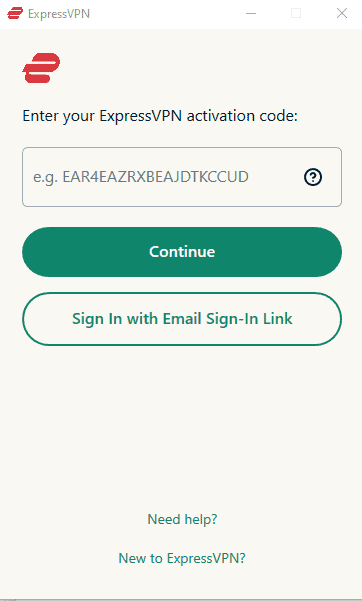 - 啟動應用程序並登入使用您的 ExpressVPN 激活碼。