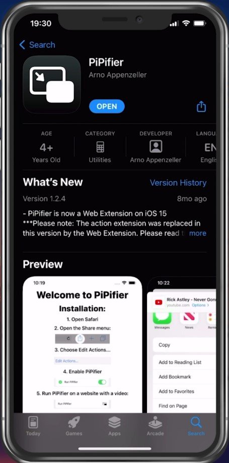 默認情況下,YouTube 不允許用戶直接從 iOS 設備上的應用程序使用畫中畫 (PiP),但您可以使用其他應用程序從瀏覽器使用畫中畫。為此,請前往您的 App Store 並查找PiPifier。免費的應用程序應該在幾秒鐘內下載完畢。