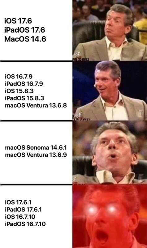 現在,我知道你在想什麼,你在想,“但是傑米,我有一台 Mac,我有一台舊 iPhone,我有一台舊 iPad,我也想要軟件更新!”也許您甚至會因為不在這些設備上安裝更多系統軟件更新而感到興奮。但如果您擁有 Mac 或更舊的 iPhone 或 iPad,也不要失望,因為您最好相信這些設備也有火熱的軟件更新。 MacOS Sonoma 14.6.1 伴隨著大號兩聲嘟嘟聲的美妙到來,與 MacOS Ventura 13.6.9 一起到來。如果您擁有舊款 iPhone 或 iPad,並且渴望更新,老庫比蒂諾蘋果園的軟件更新經銷商將為您提供最新的 iOS 16.7.10 和 iPadOS 16.7.10 批次。