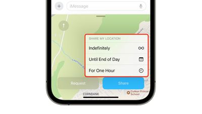 - 將出現顯示您當前位置的地圖。如果您想分享,請點擊分享,然後選擇持續時間:無限期,直到一天結束, 或者一小時。或者,要請求正在與您交談的人的位置,請點擊要求。