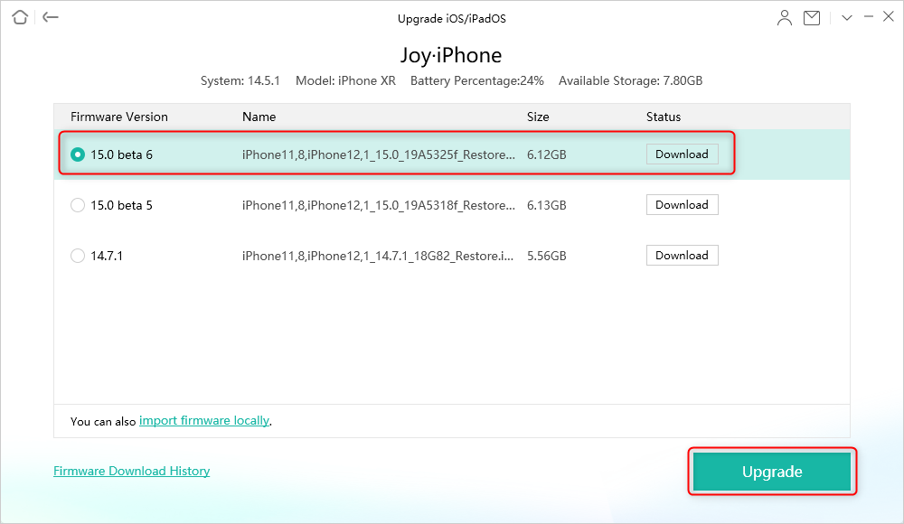 步驟3。然後選擇您想要的 iOS 版本並下載。單擊升級按鈕繼續。