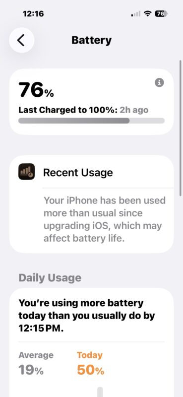 最後,由於它是一個新的操作系統,有一些相當重大的變化,因此用戶在探索新功能和新界面外觀時,比以前更多地使用 iPhone 或 iPad 是很常見的。而且,顯然,更多地使用設備會導致電池壽命縮短,這是正常的。