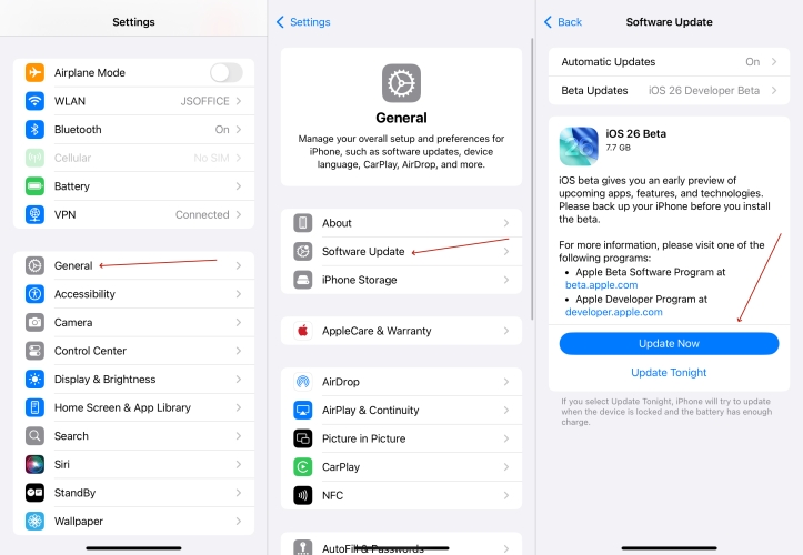 有時,您的設備可能不會顯示 iOS 26 Beta,因為 Beta 更新已關閉。要解決此問題,只需按照以下步驟在“設置”中啟用 Beta 更新即可。開機後,您的設備將檢測到 iOS 26 Beta 版本,您可以繼續更新設備。