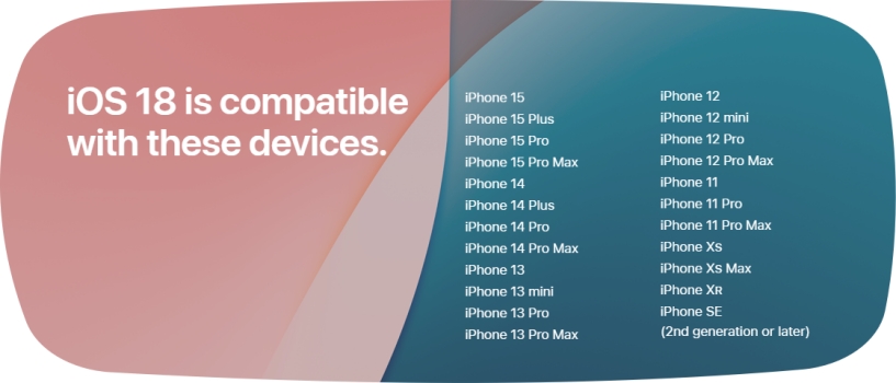 iOS 18:支持 iPhone Xs 及更新機型。然而,先進的 Apple Intelligence 功能需要更新型號的 iPhone 15 Pro 系列及更高版本。