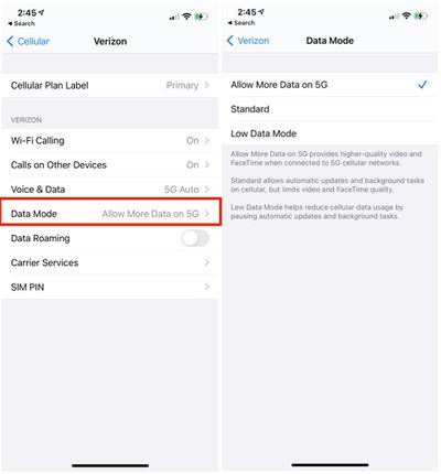 您可以調整多種數據模式。默認情況下,iPhone 12 型號設置為“允許在 5G 上使用更多數據”,這在連接到 5G 蜂窩網絡時提供更高質量的視頻和 FaceTime。