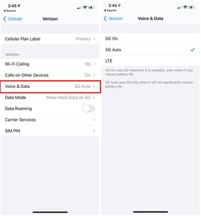 從“語音和數據”菜單中,您將看到三個選項:5G 打開、5G 自動和 LTE。 5G Auto(默認設置)僅在 5G 不會顯著縮短電池壽命時才使用 5G。