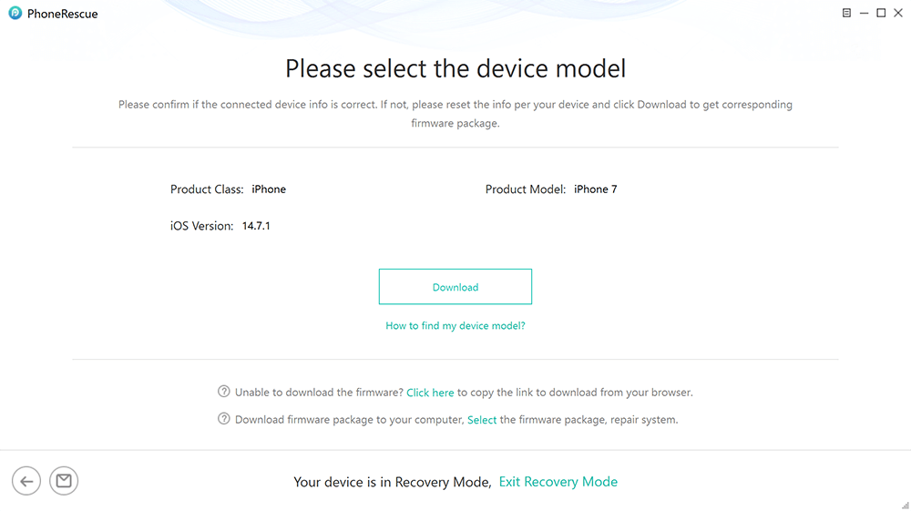 按照屏幕上的說明進入恢復模式。並且,單擊下面的“下載”按鈕獲取適合您 iPhone 的匹配固件。