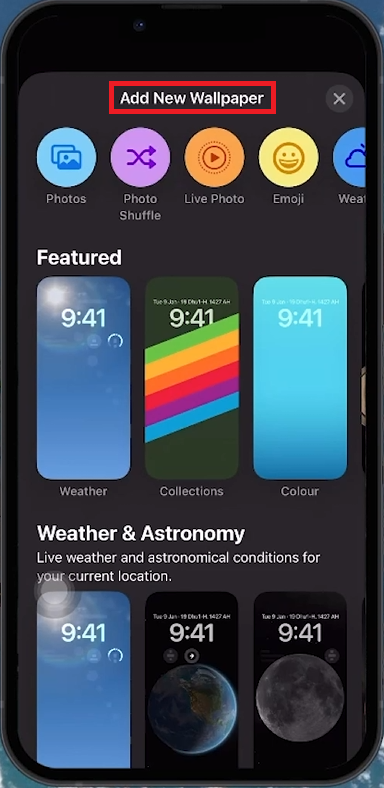 進入壁紙編輯模式:點擊並按住鎖定屏幕上的空白區域,直到壁紙顯示為活動狀態。