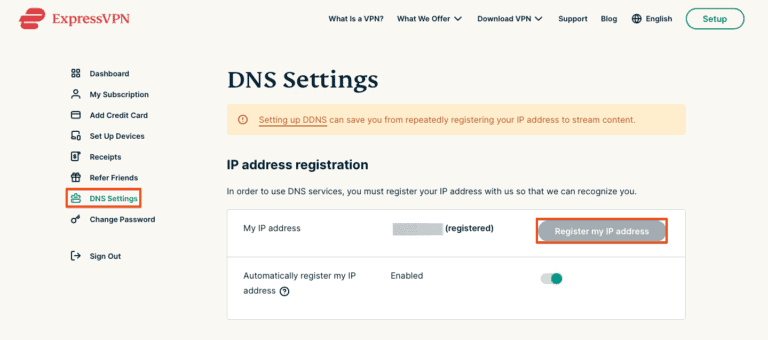 - 前往我的帳戶 > DNS 設置並點擊“註冊我的IP地址”。