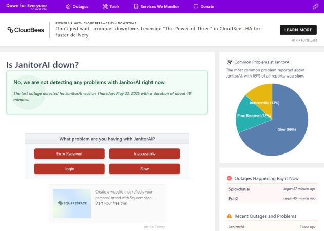 截至 2025 年 5 月 22 日,Janitor AI 已投入運行。最近一次中斷發生在 2025 年 5 月 20 日,持續約 31 分鐘。如果您懷疑出現中斷,請按照以下方法驗證 Janitor AI 的狀態。請按照以下提示檢查 Janitor AI 是否已關閉。