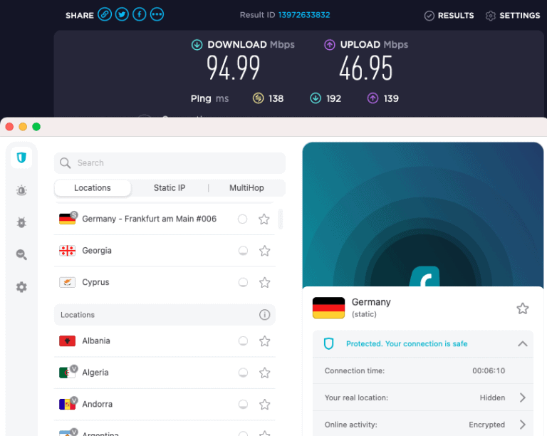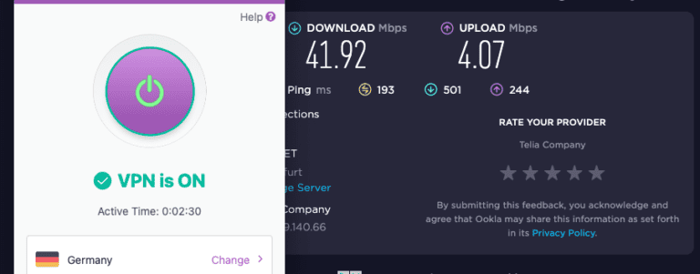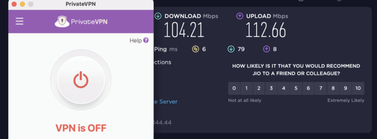 使用連接到最近服務器的 PrivateVPN 進行速度測試。