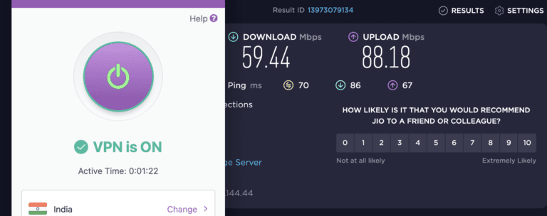 當我連接到最近的服務器時,它偶爾得分不錯,但在大多數測試中,它給了我一個我的 100 Mbps 網絡平均下載速度為 59.44 Mbps。