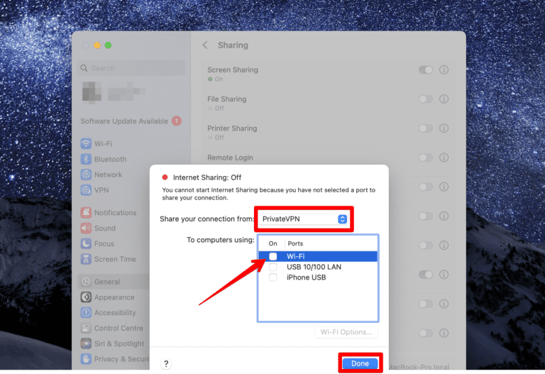 - 在“分享您的連接” 下拉菜單,選擇私人VPN。