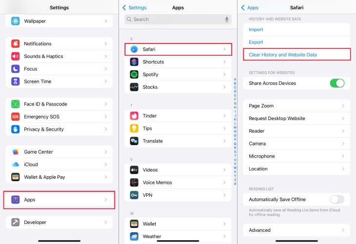 步驟2。前往設置 > Safari,然後向下滾動以點按清除歷史記錄和網站數據。